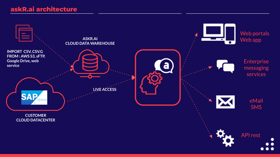 C’est pour cette raison qu’ajouter une couche conversationnelle à une base de données SAP HANA (et à l’ERP SAPHANA/S4 dans le cas du challenge Vinci), c’est la garantie d’un accès direct et immédiat aux informations. Les process sont allégés, les collaborateurs gagnent en autonomie et en efficacité grâce à un databot disponible 24/24 pour répondre aux questions sur leurs données. Sans compter que l’on peut interroger askR.ai dans un environnement de travail familier afin de rendre l’expérience conversationnelle fluide : email, SMS, Teams, Slack, web app…